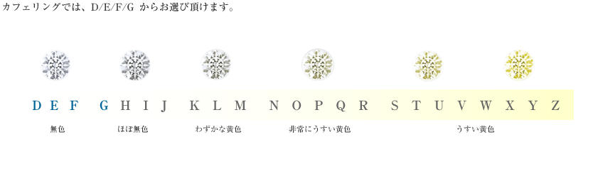 2.カラー。ダイヤモンドは無色透明からはじまり黄色味が濃い程安くなります。ファンシーカラーと言う例外はありますが、そんなものは店の表には普通、おいてありませんから除きます。Dから始まり、Zまで等級が決まっています。